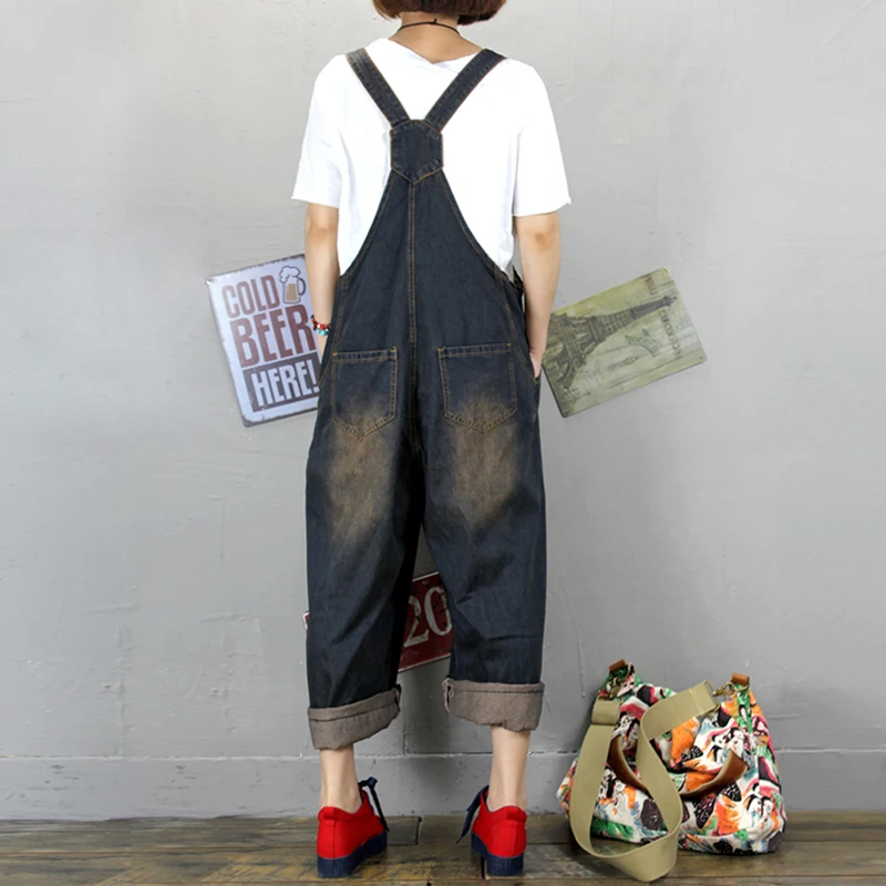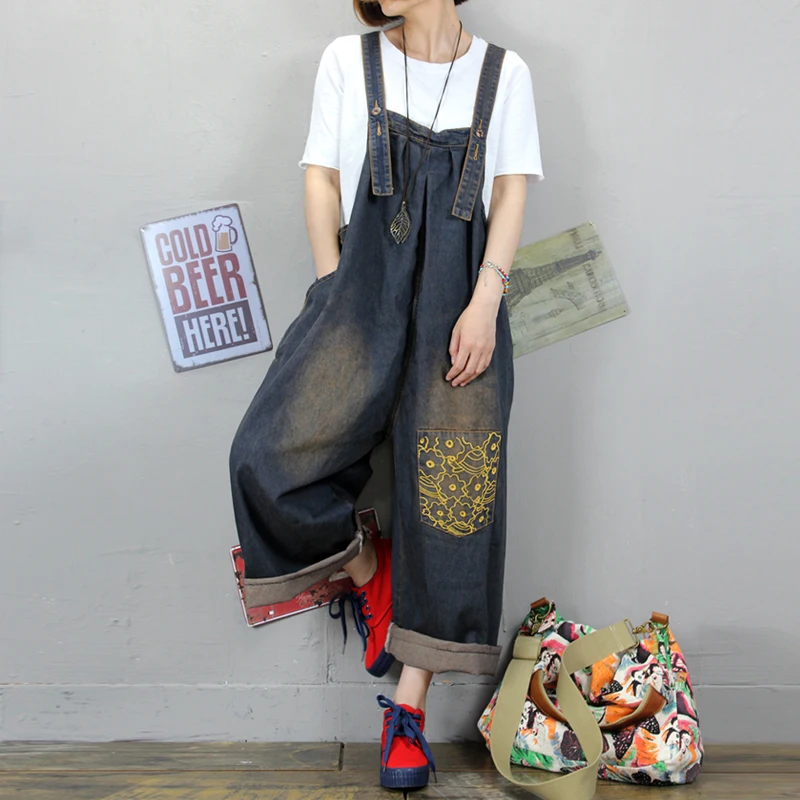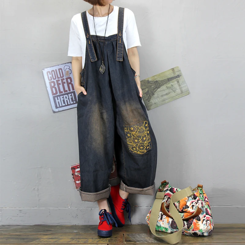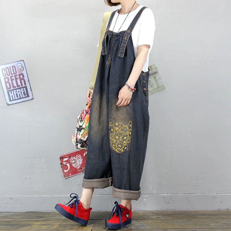 Images of Free Shipping 2019 Fashion Embroidery Overalls Wide Leg Cotton Loose Jumpsuits And Rompers With Pockets Ankle Length Jumpsuit :